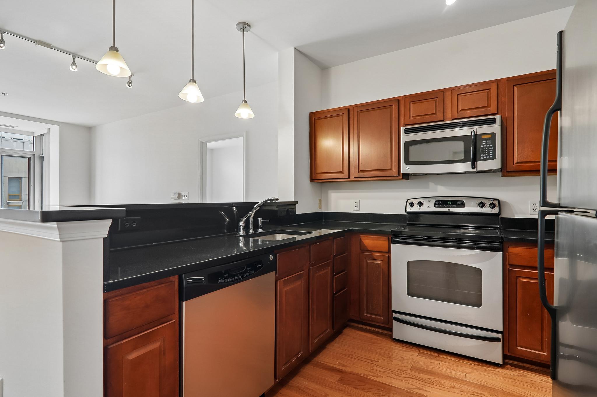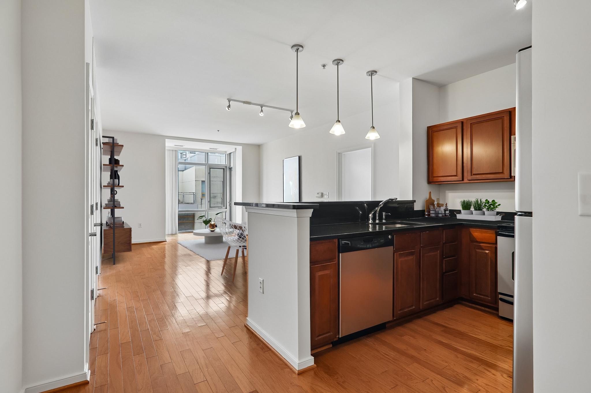 Step into modern urban comfort with this impeccably located 2-bedroom, 2-bathroom condo in the heart of Hyattsville’s most vibrant district. This home features a bright, open-concept main living area highlighted by gleaming hardwood floors and a layout designed for both relaxation and entertaining. The updated kitchen is as functional as it is stylish, boasting stainless steel appliances, ample cabinetry, and soft track lighting that creates a warm, inviting ambiance. The integrated eat-in counter provides the perfect spot for quick morning coffee or casual meals. For those who crave a bit of nature, the unit offers two distinct retreats: a charming bump-out window cove ideal for a lush indoor garden or reading nook, and a private balcony perfect for evening relaxation. The living quarters are designed for privacy and convenience, with carpeting in both bedrooms. Each bedroom features its own generously sized en-suite bathroom, making this an ideal setup for roommates or guests. Beyond the front door, you are immersed in an array of amenities. Located less than one mile from the Metro, across the street from a Regal movie theater, with blocks of diverse dining options and local boutiques, the best of this walkable suburban enclave is at your fingertips. With the Mall at Prince George’s only one block away for all your shopping essentials, this condo offers the perfect blend of suburban convenience and urban flair.